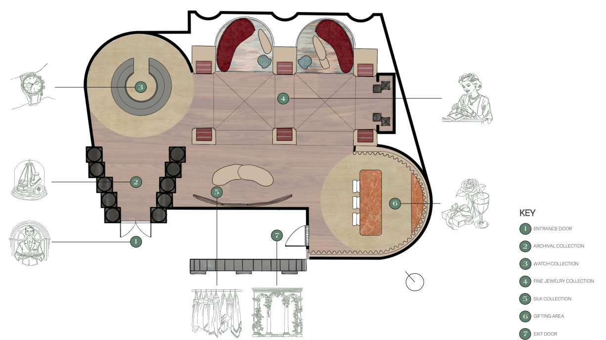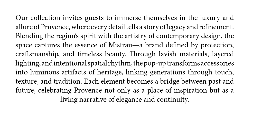Created as part of a collaborative studio course, Mistrau reimagines a luxury fashion brand’s seventy-fifth anniversary through a pop-up experience set within the historic Pierre Cardin Quarry in Lacoste, France. This project explores the intersection of retail storytelling and spatial design, using the site’s carved stone landscape to frame a narrative of renewal and legacy. Designed as one of five interconnected pavilions, the Non-Leather Accessories space serves as an intimate showcase of craftsmanship, inviting guests to engage with jewelry, scarves, and fine accessories that embody the art of Provençal refinement. The design honors the brand’s origin as a protector against the region’s mistral winds, transforming that symbolism into a setting where materials, light, and form act as metaphors for preservation and transformation. Through intentional layering of textures and choreographed movement, Mistrau presents the accessories collection not simply as retail display, but as a sensory journey celebrating the enduring heritage and innovation of Provence.