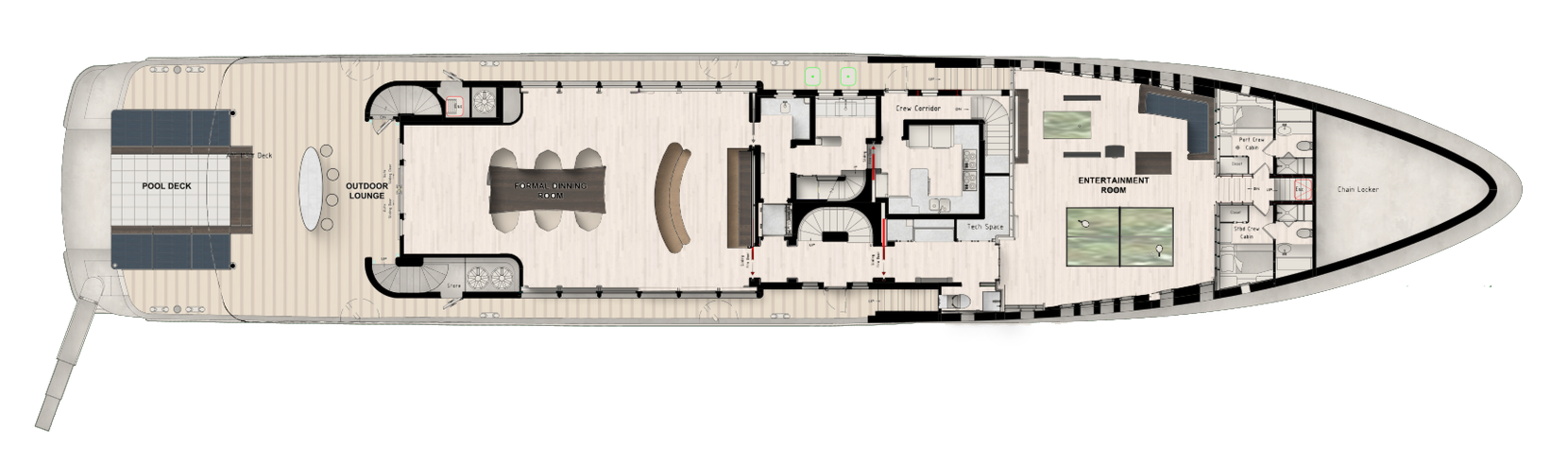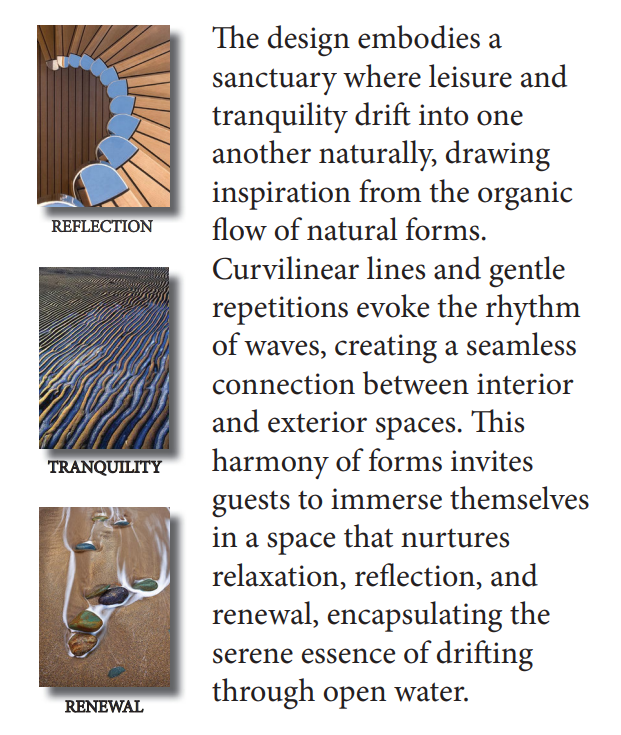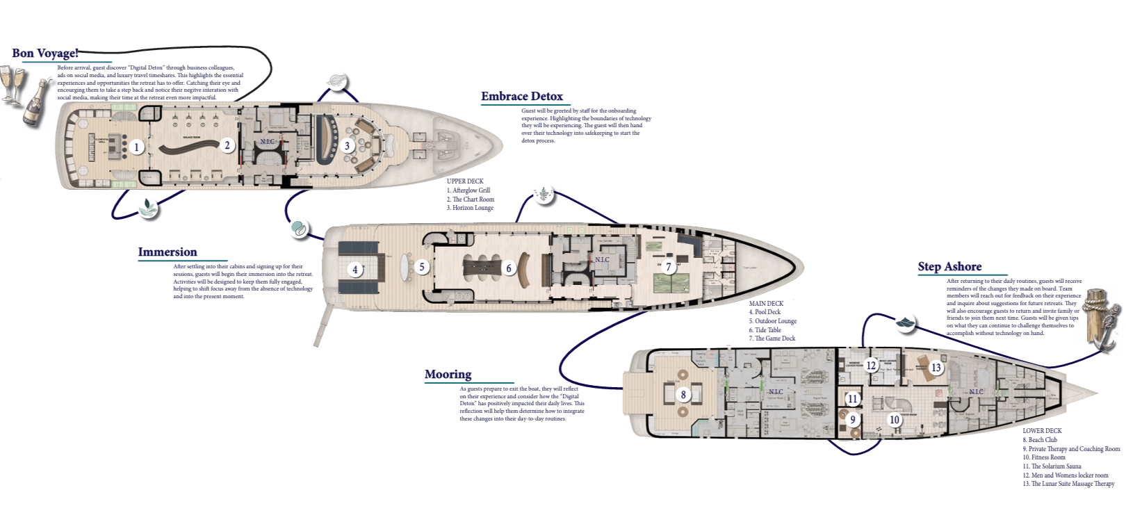 My capstone project, Serenemare, is a luxury yacht interior designed as a digital detox retreat. The concept focuses on reducing stress and restoring balance for high-achieving professionals by removing technological distractions and emphasizing mindfulness, reflection, and personal growth. Biomimicry and biophilic design principles inform the spatial layout, material selections, and sensory experience, resulting in interiors that are both restorative and sophisticated. The project positions the yacht as more than a vessel—it becomes a sanctuary for wellness at sea.